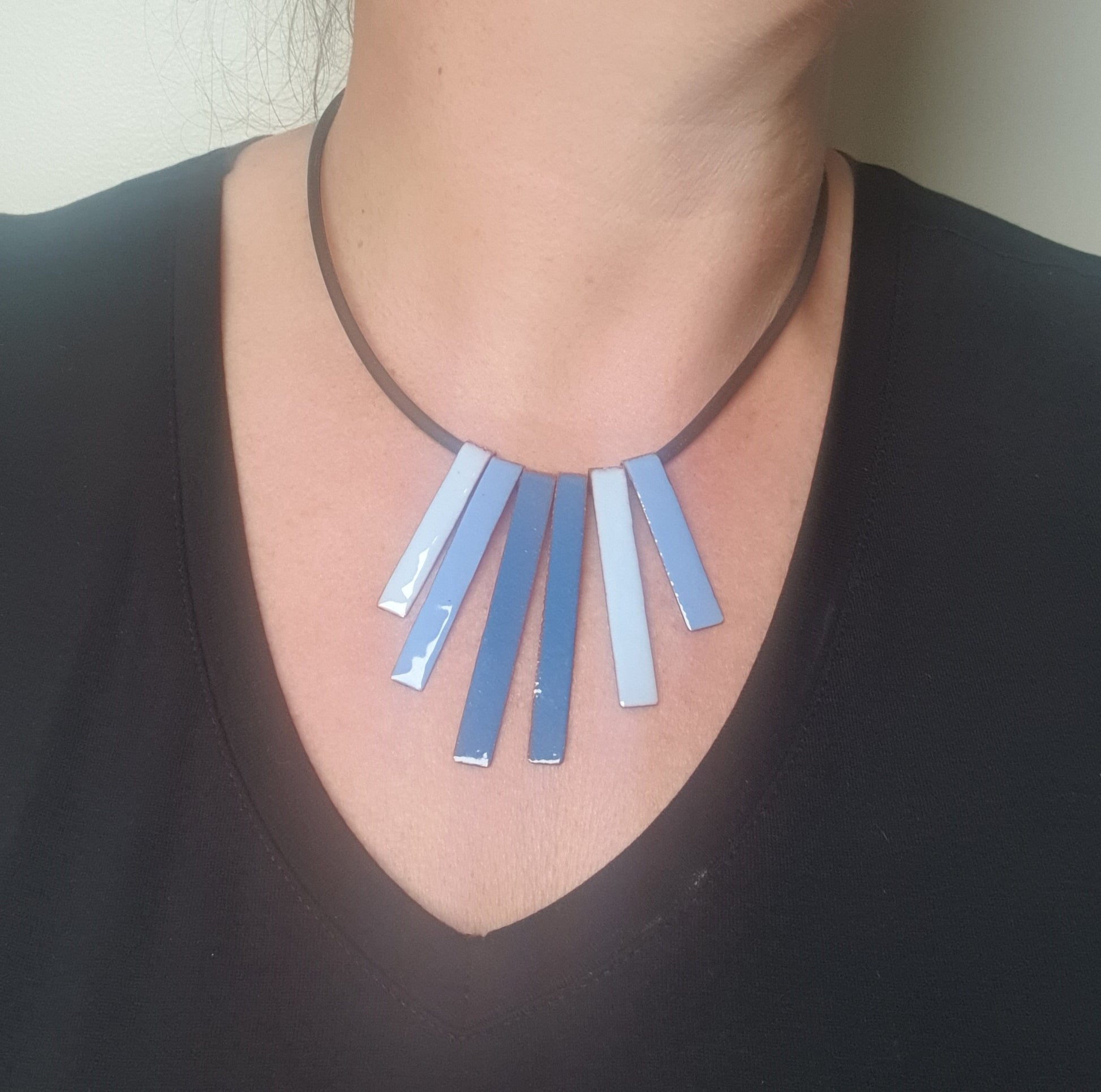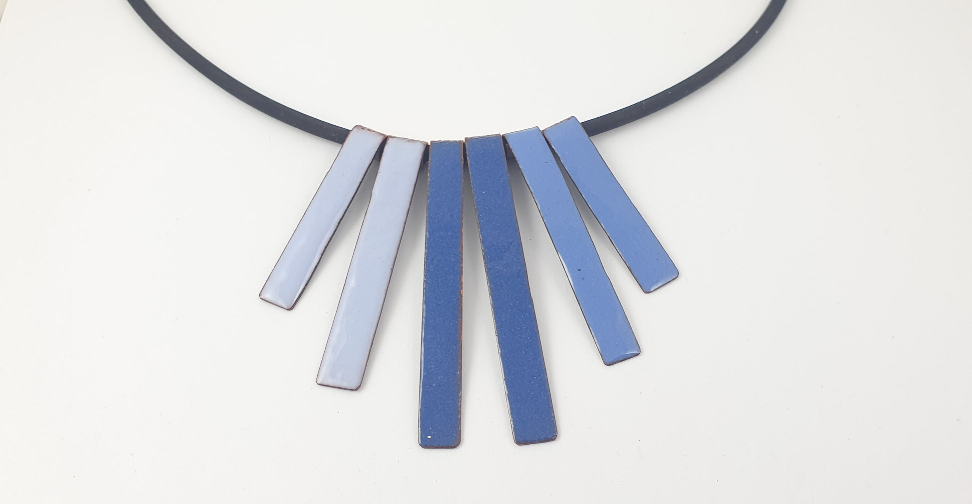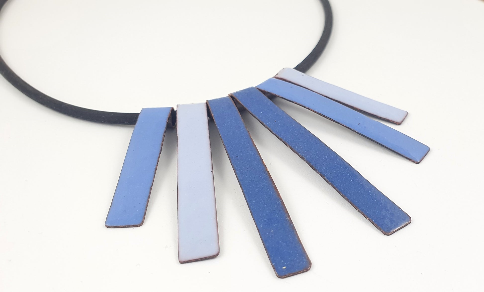 I have hand cut the copper lengths then torch fired a collection of blue coloured vitreous glass enamel onto the copper. The back of the copper has been counter enamelled meaning that the copper does not touch your skin or clothes therefore no green copper stain.