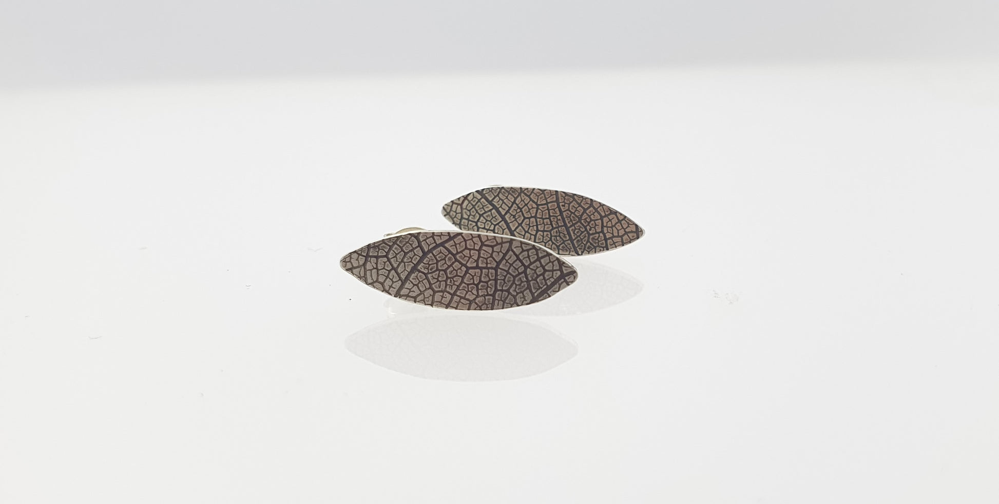 I textured and cut out a contemporary leaf shape from sterling silver sheet. Next I oxidised it and polished the high points highlighting the design.