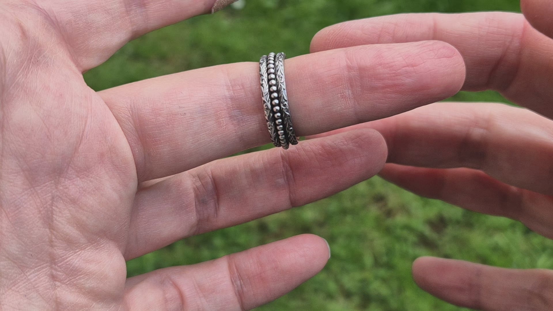 The central band is adorned with a two leafy swirling patterns and has been blackened to add texture and depth. Between the two patterned bands is a delicate beaded band. This beaded spinner provides a soothing, play-like quality when spun.