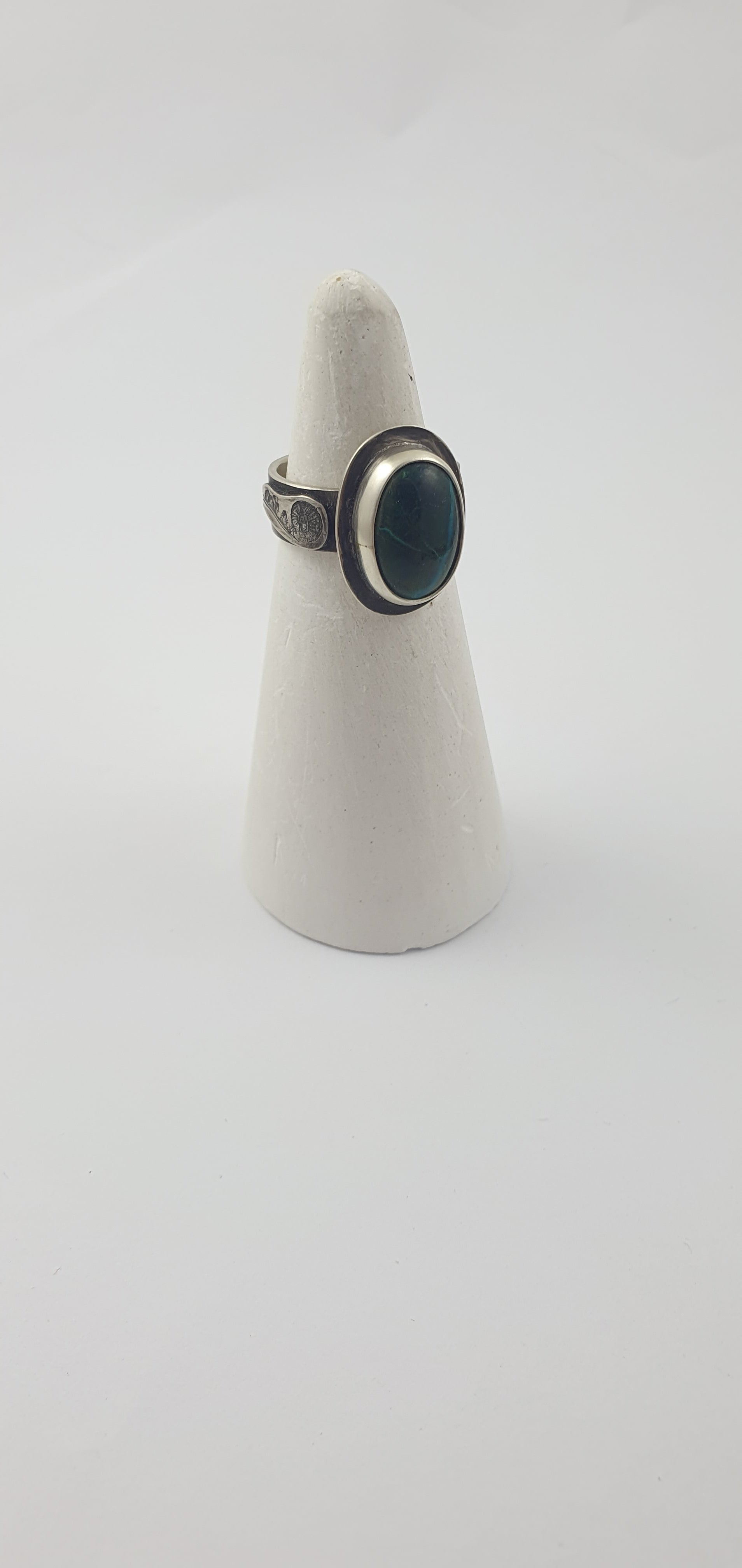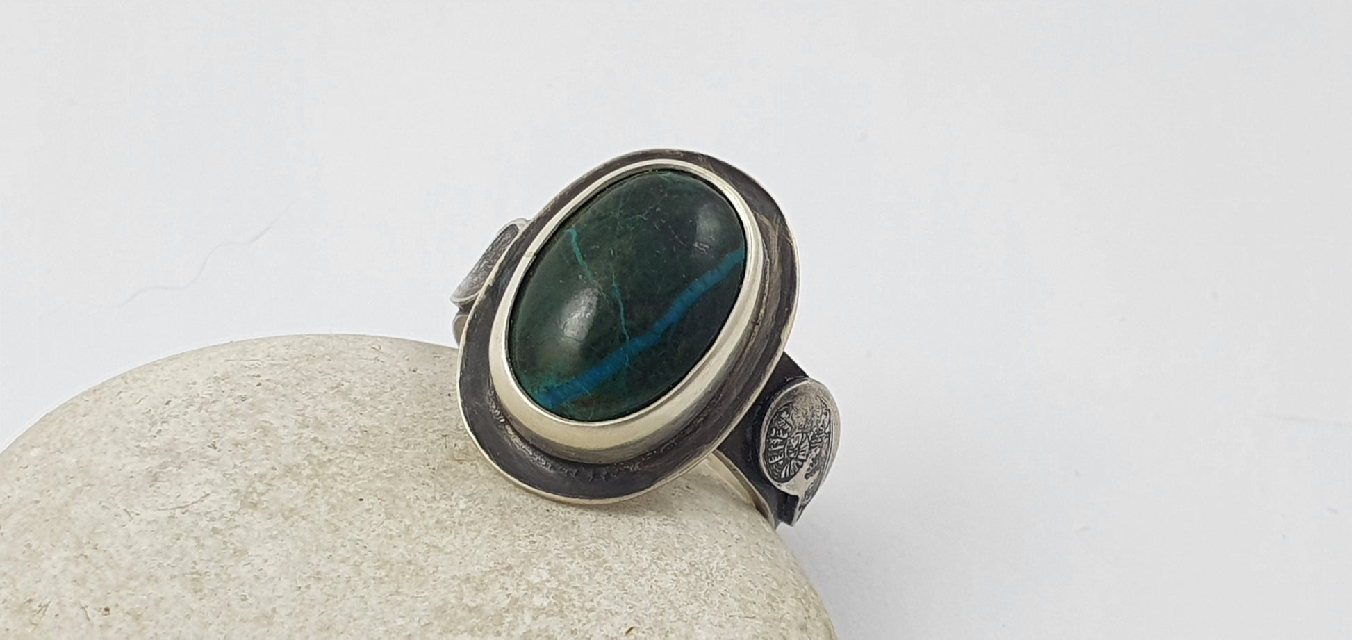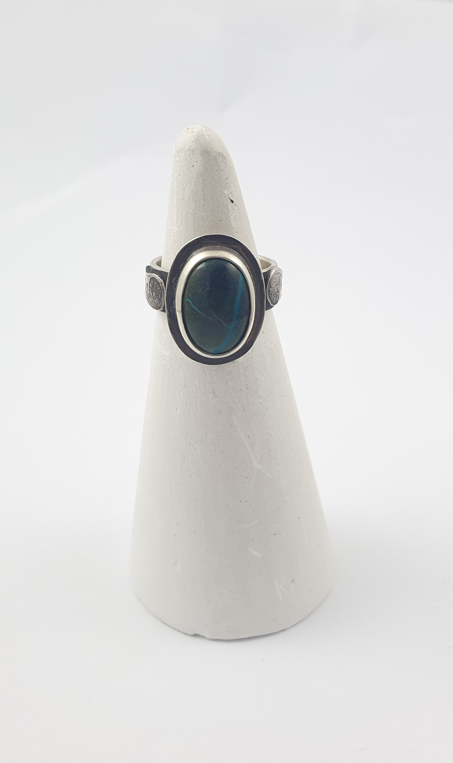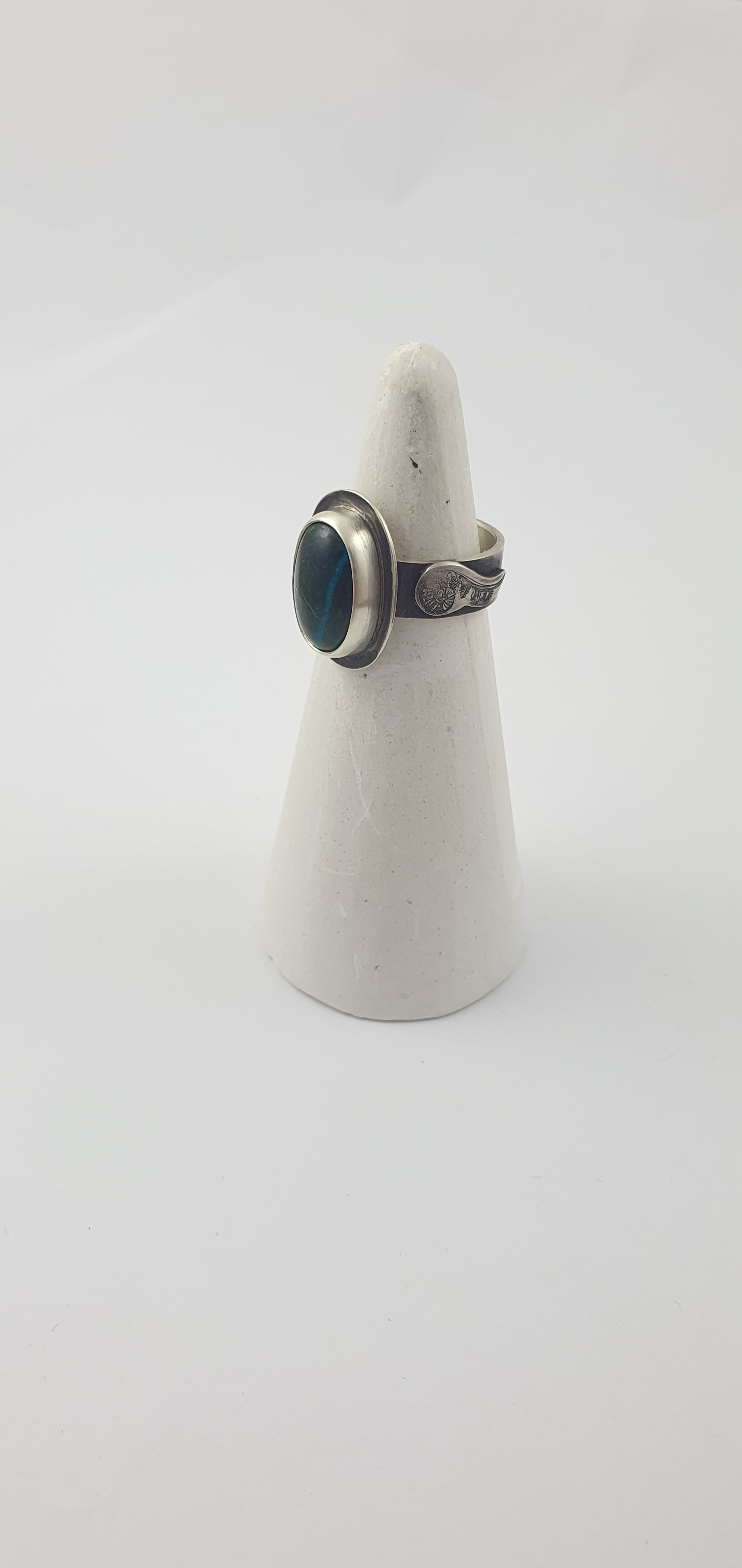 This little cutie is a bit of a mystery to me as I'm unsure what the lovely stone is. The oval stone has been bezel set in sterling silver. I have stamped and cut out ferns and soldered them on to the ring shank. The ring shank has been oxidised to add depth to the ring.