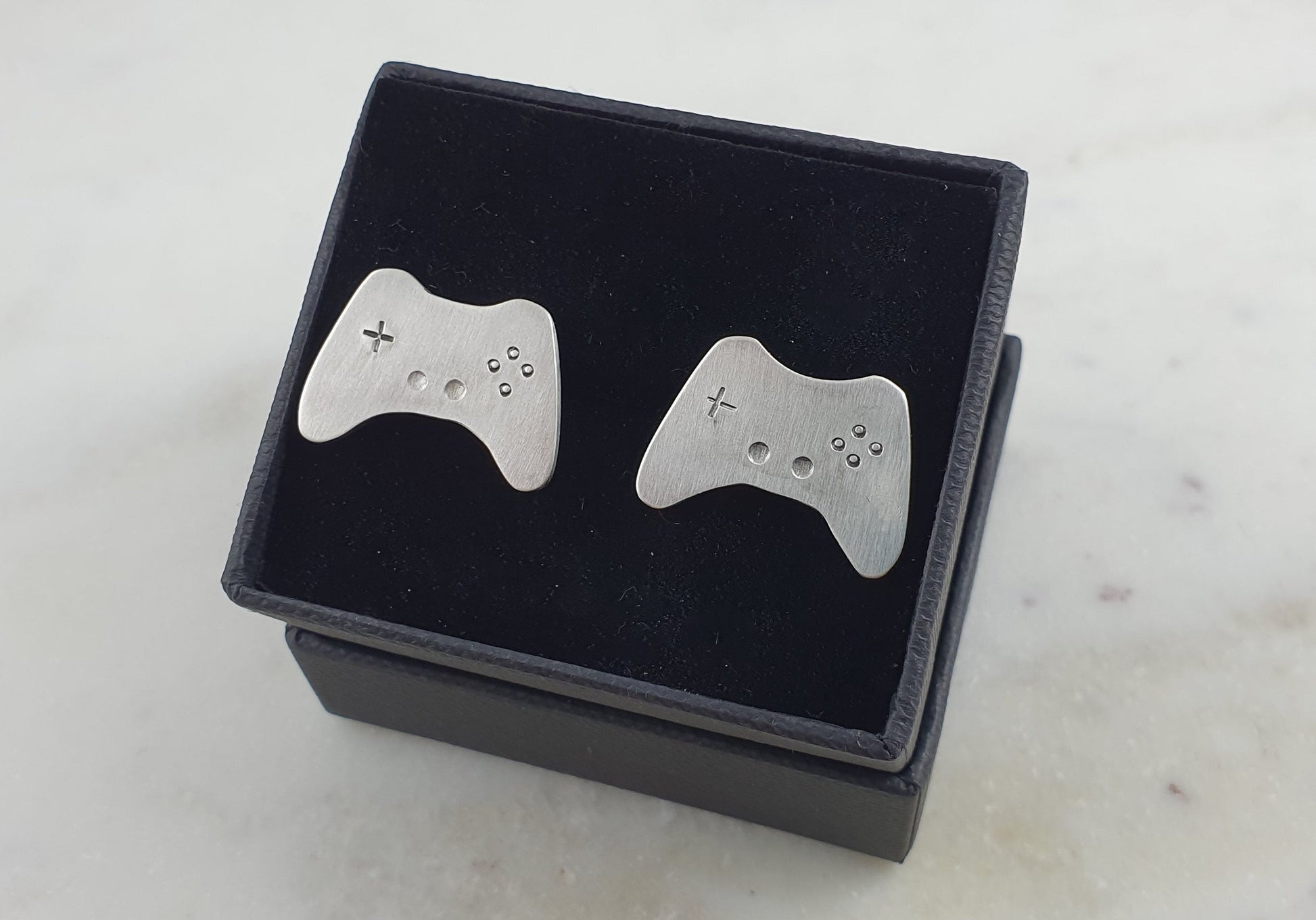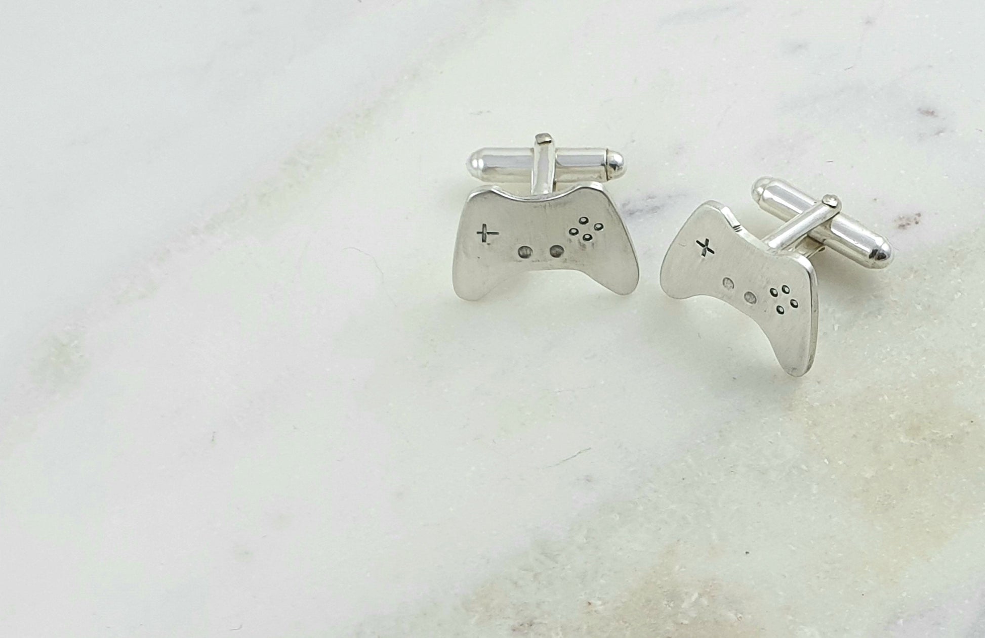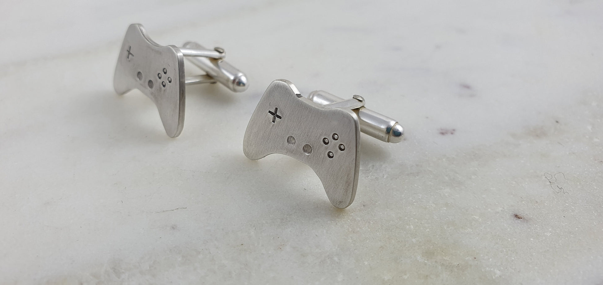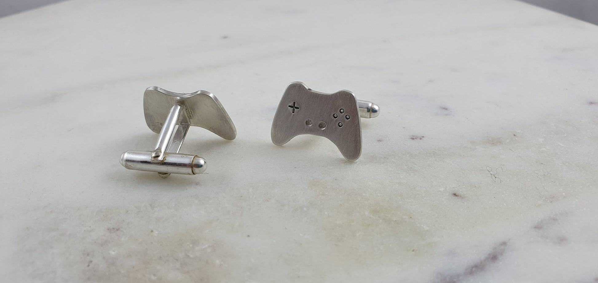 The cufflinks have been hand cut from sterling silver plate with a jeweller's saw. They are 1.2 mm thick so are a solid cufflink. I have then added the controller details and applied a patina to highlight the detail.