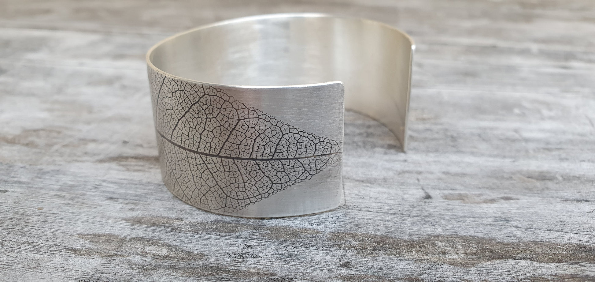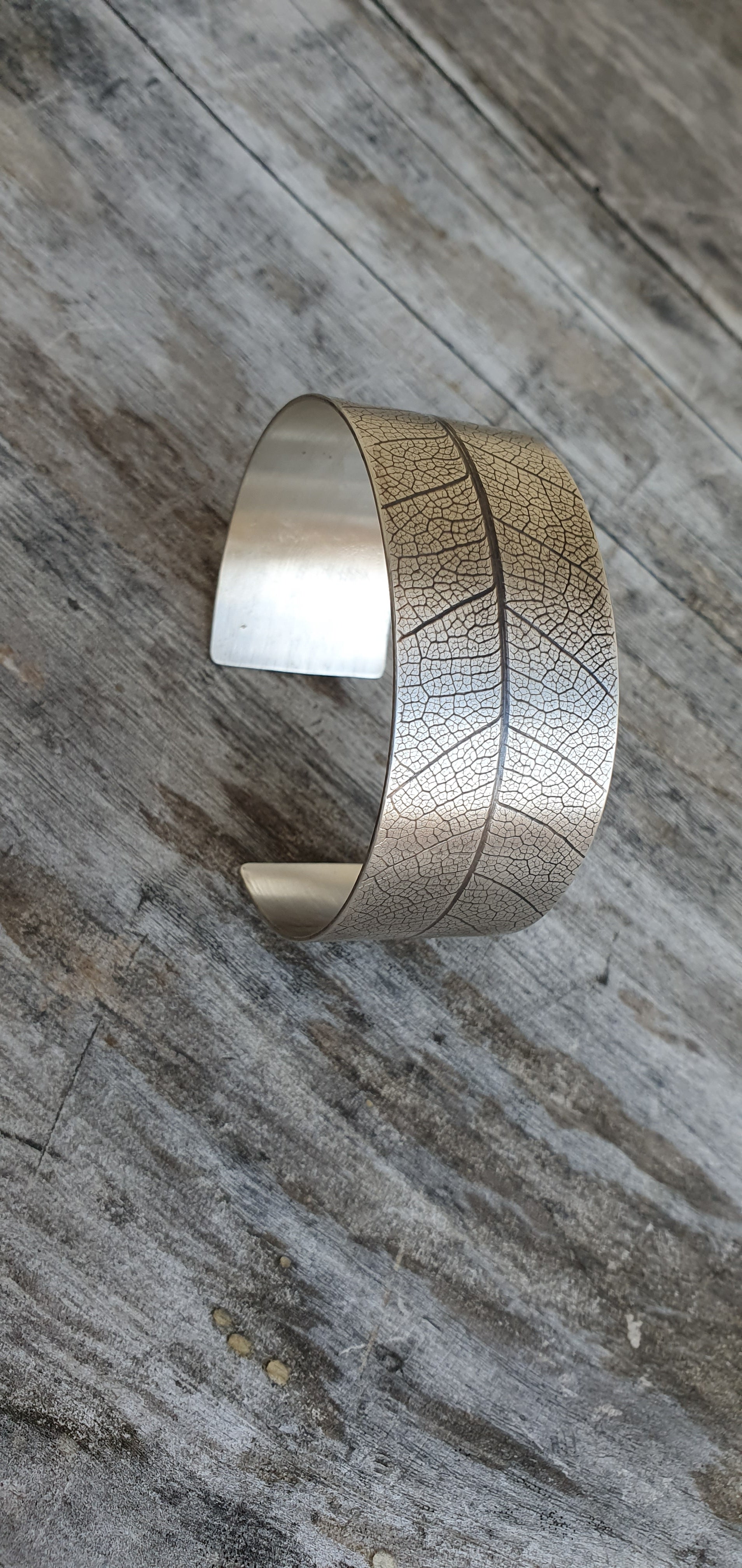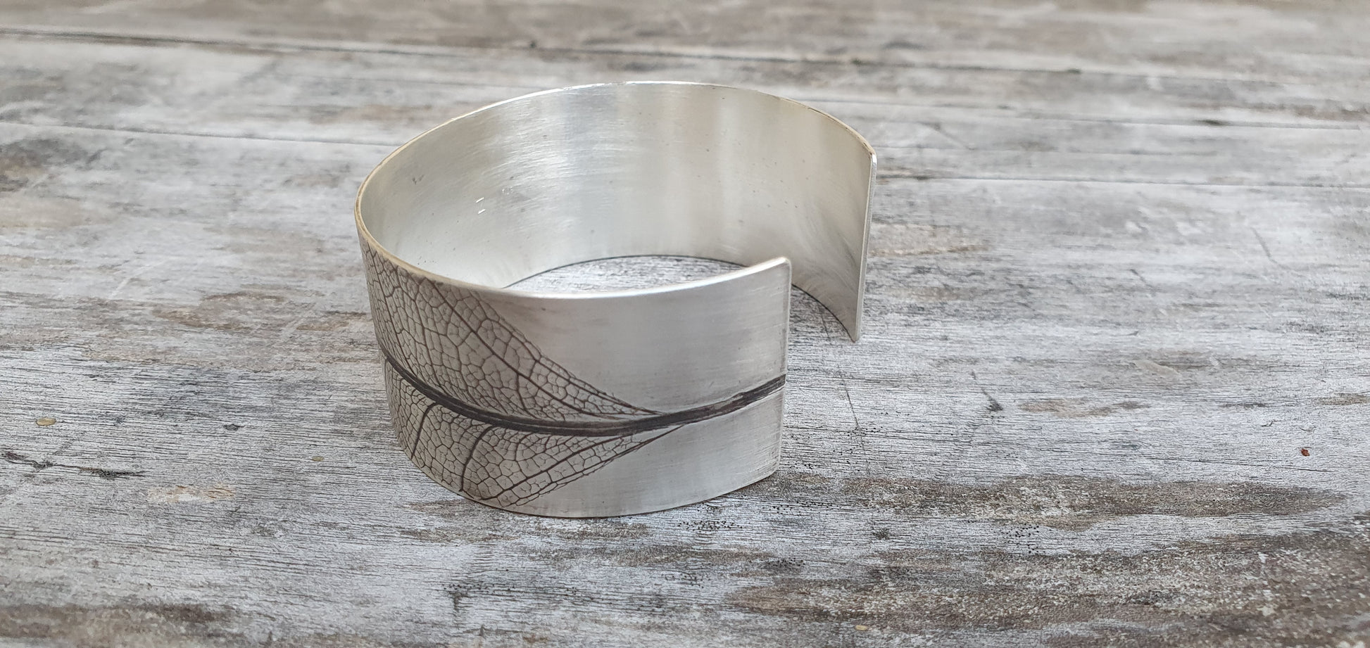 I have textured sterling silver sheet with a skeleton leaf. Next I formed the shape then lots of sanding and polishing. After that I oxidised the cuff and polished the high points to highlight the texture.