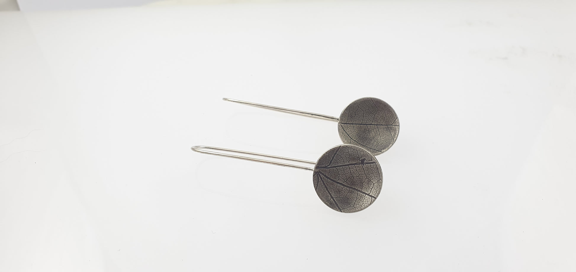 These classic earrings have been made by texturing sterling silver sheet. Next I cut the disc shapes and formed the dome. the domes were soldered on to sterling silver ear wires. I oxidised the discs and polished the high points to highlight the texture.