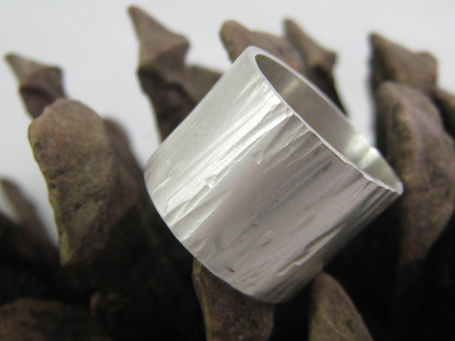This hammered wide ring is sterling silver and has been hand-cut, fabricated and hammered for a textured finish. The texture has been randomly made, therefore, the ring you order will have a similar pattern.