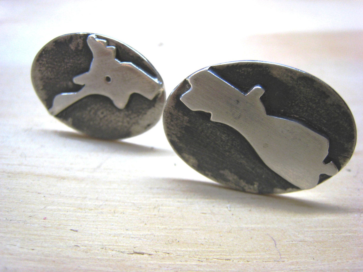 These stylised sterling silver cufflinks have been oxidised so the islands pop. Lake Taupo can been seen on the North Island and Stewart Island is at the bottom of the South Island.