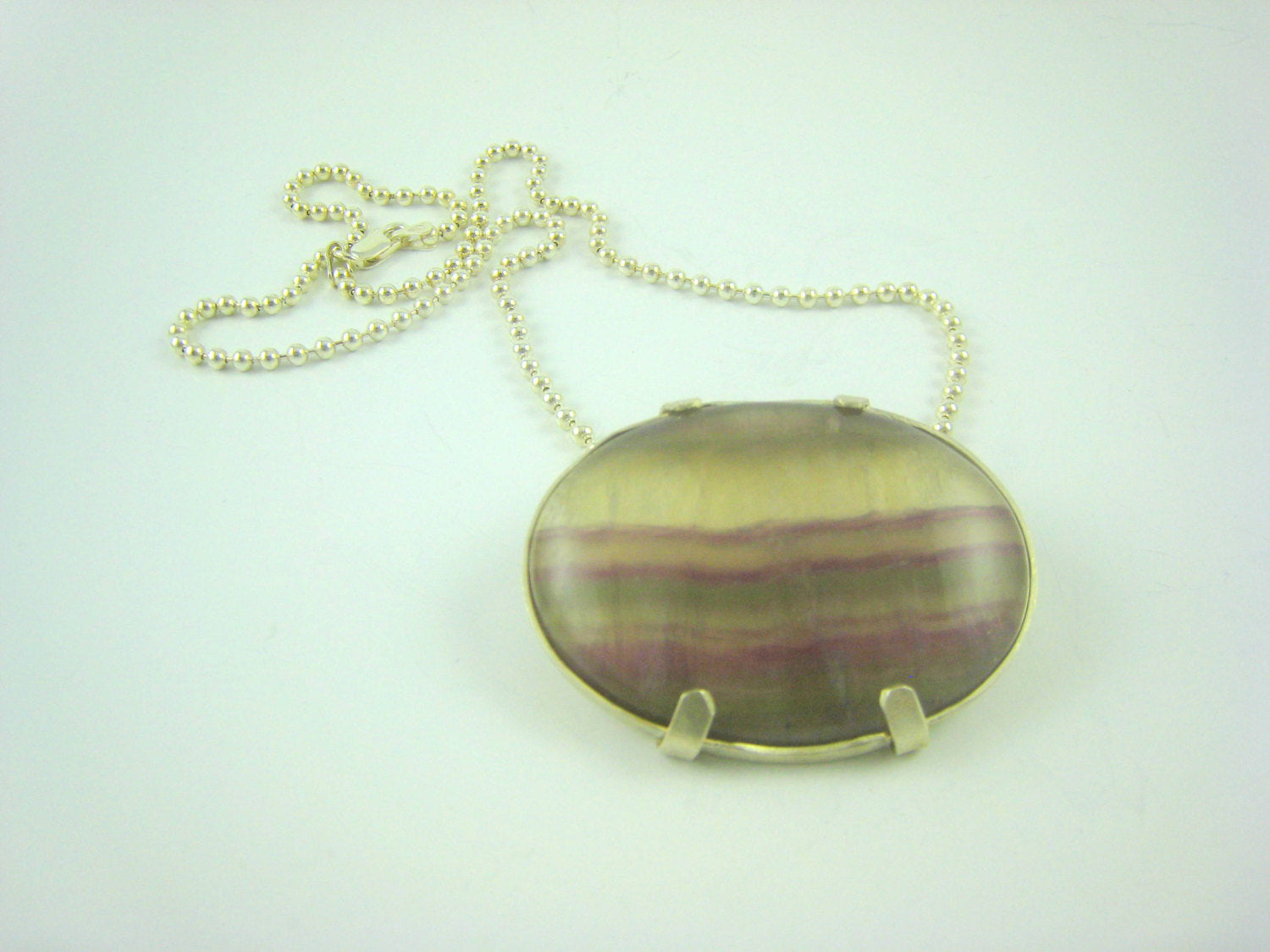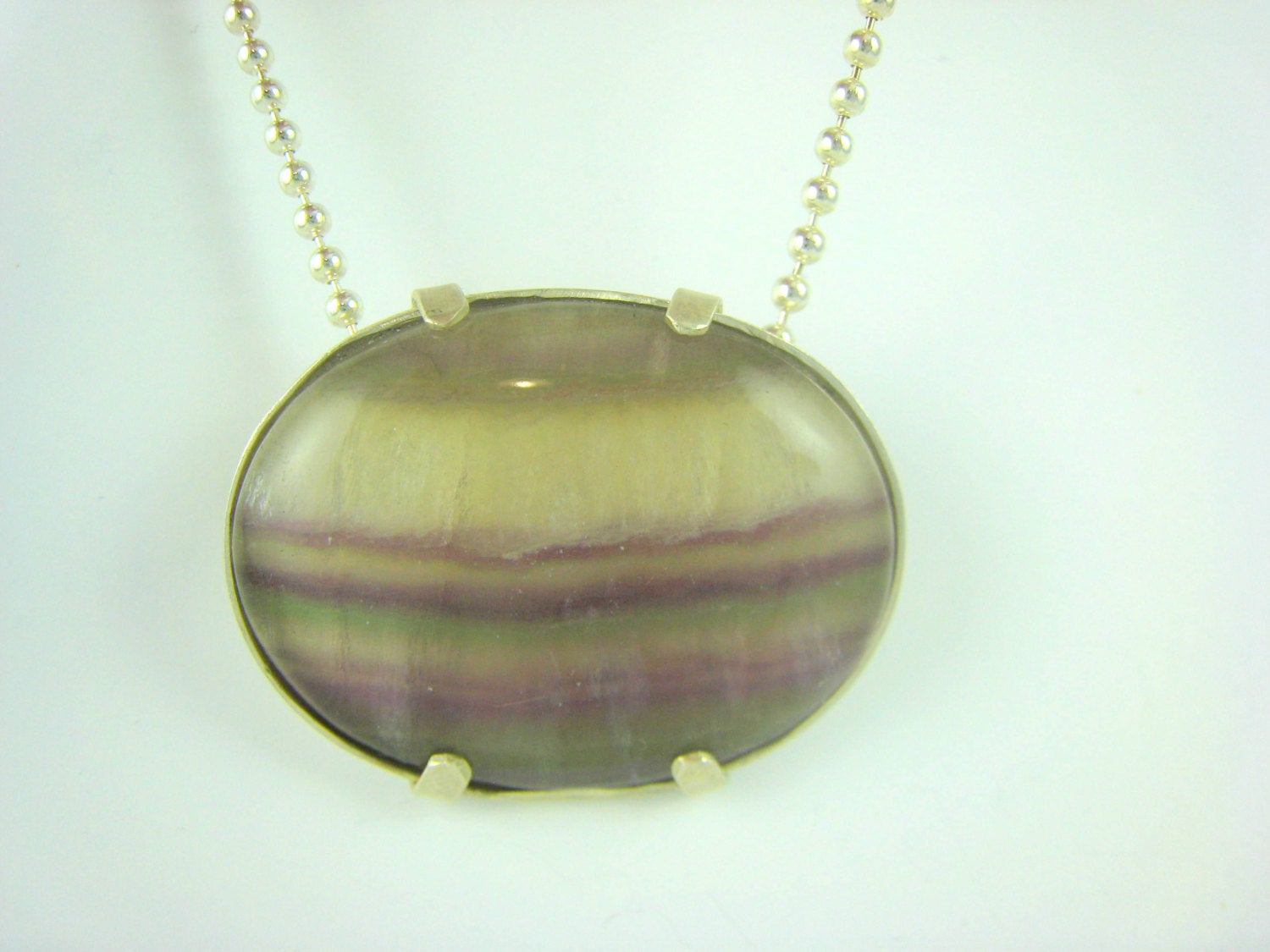 This sterling silver and Fluorite necklace has been handmade using traditional silversmithing techniques. The colourful oval stone has been tab set. The tabs extend over the back of the setting as if they are "straps" and the chunky ball chain is threaded through the "straps". The setting is minimal and contemporary.