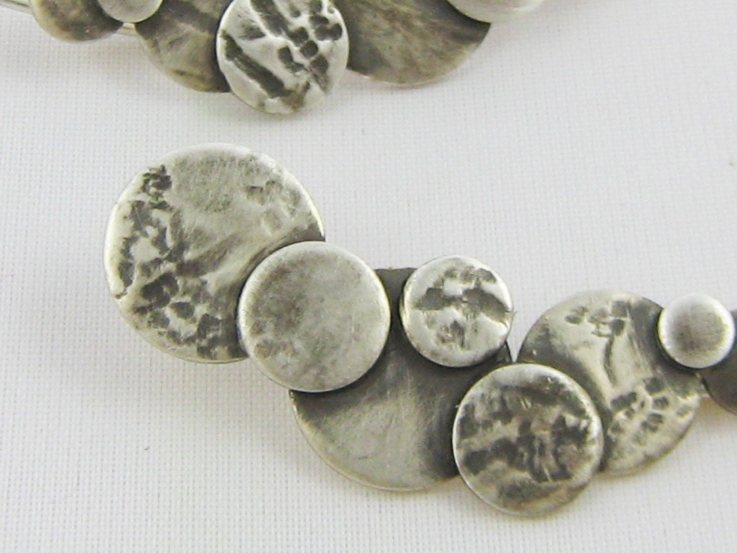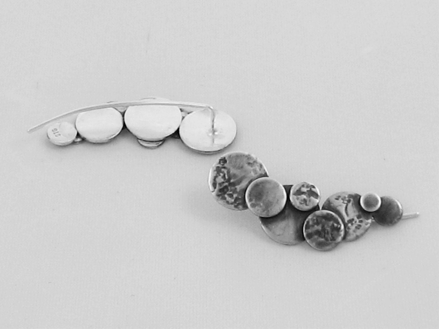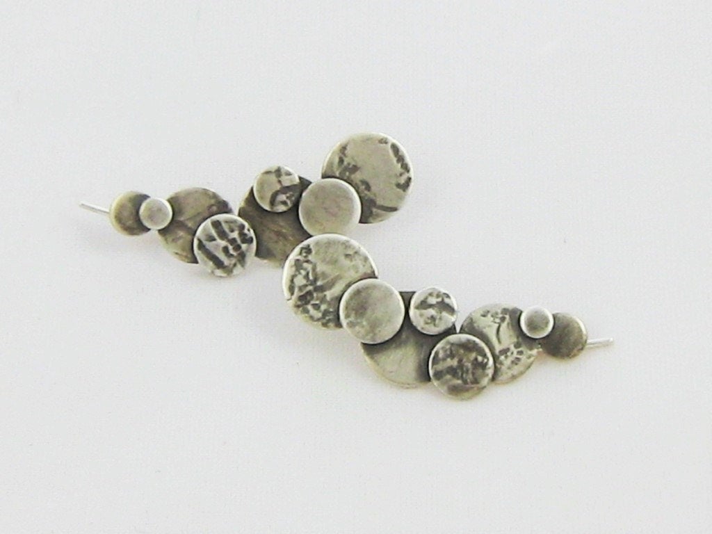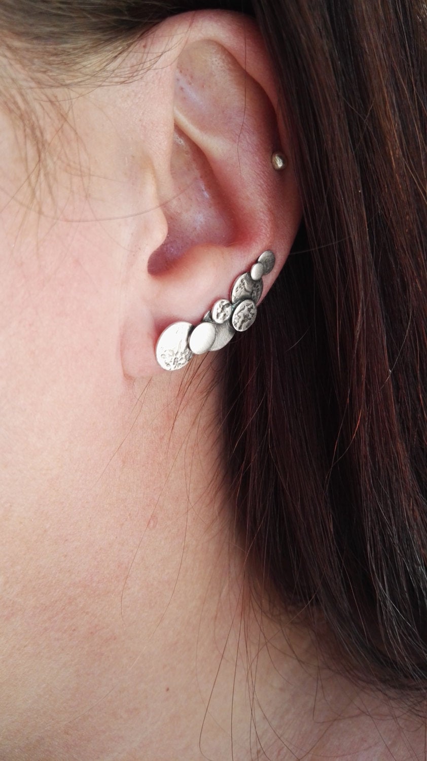 These sterling silver bubble ear climbers are contemporary and a real talking point. The climbers are lightweight and very comfortable to wear. The circles or discs have been textured, cut, soldered then oxidised to give depth to the design. The climbers only require one standard ear piercing and are easy to put on & secure. This listing is for one pair of ear climbers.