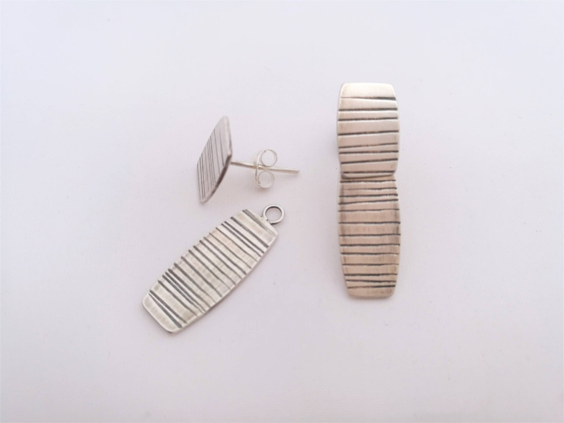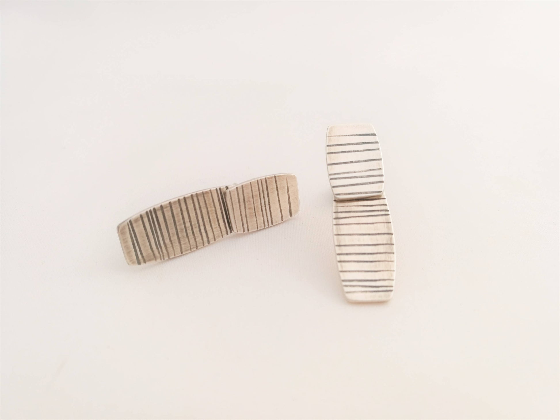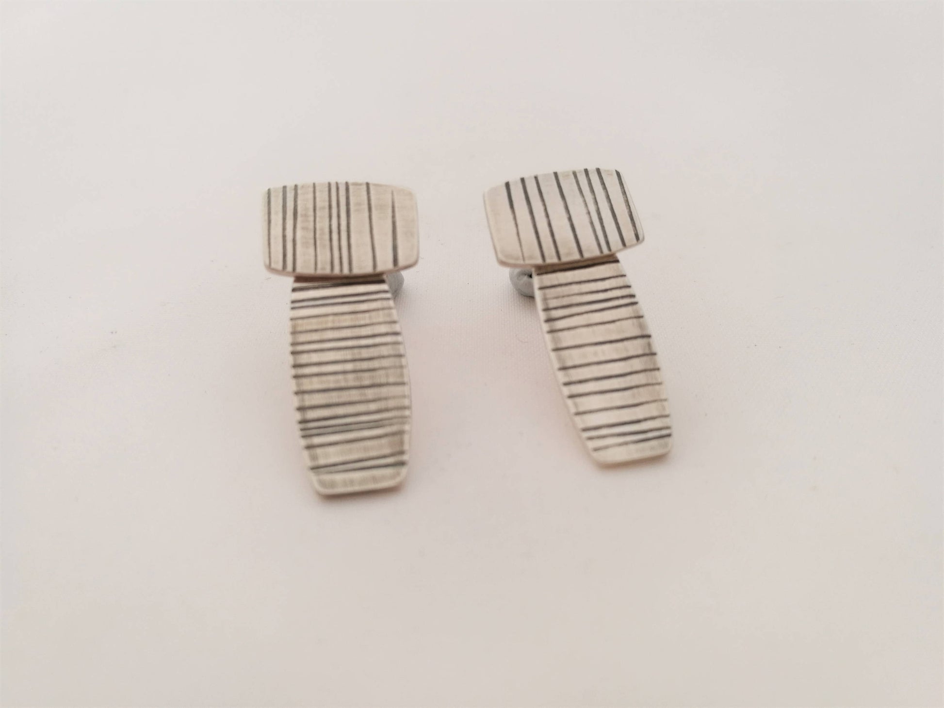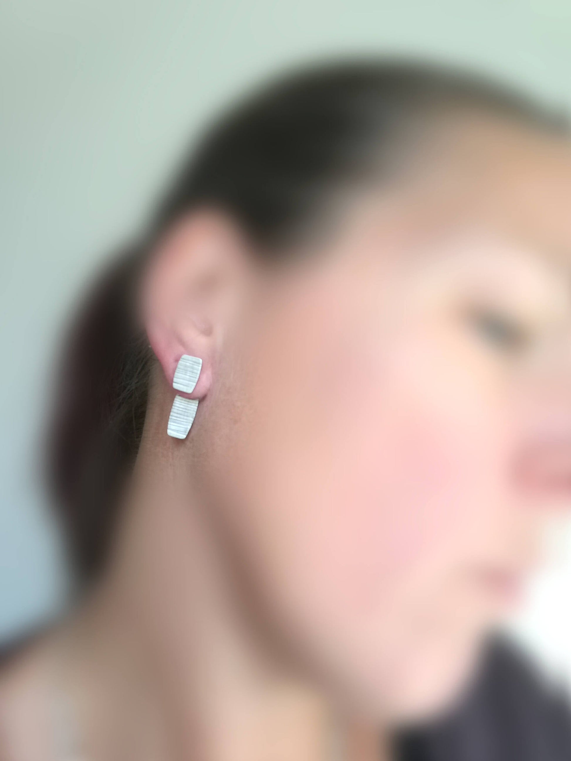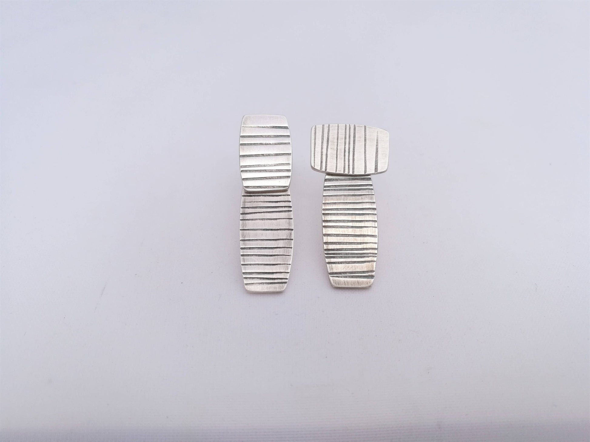 These sterling silver rectangle ear jackets are edgy and can be worn for any occasion. The rectangles have been hand-cut and textured then oxidised. You can choose to wear the studs on their own or hang the back rectangle in front or behind your ear lobe which means you have three options with these earrings. These ear jackets are lightweight and comfortable to wear.