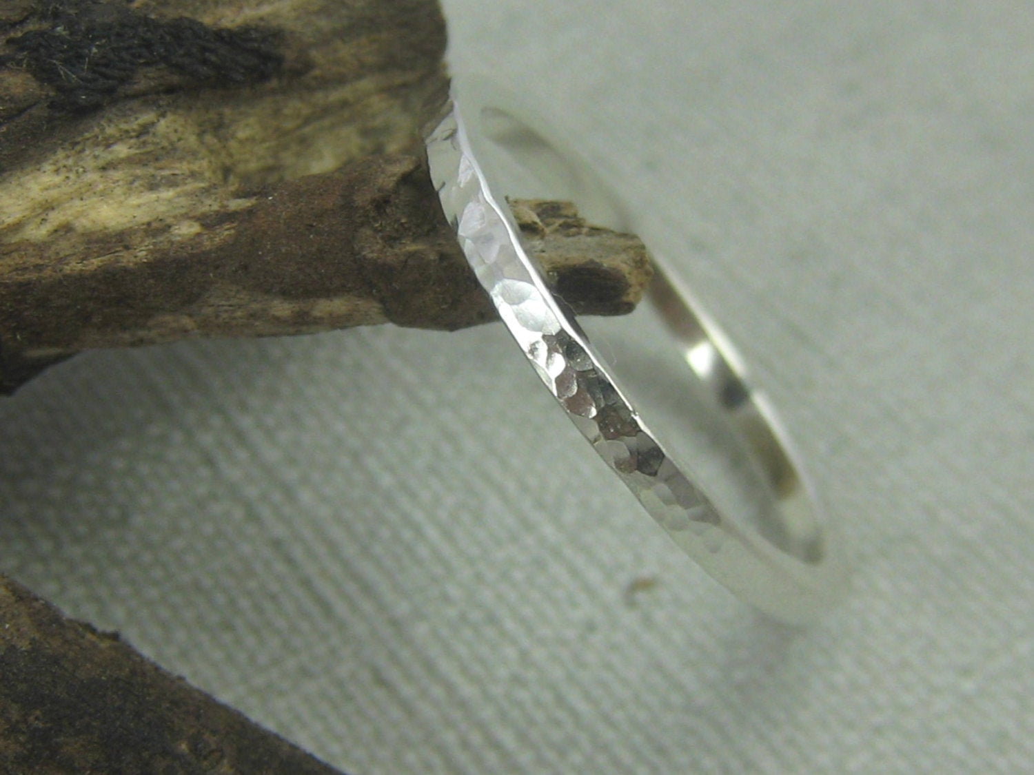 This sterling silver stacker ring has been hammered to add some texture. The texture help the ring "shimmer" and reflect the light. It looks great on it's own or combined with other stacker rings. It can also be worn as a midi ring.