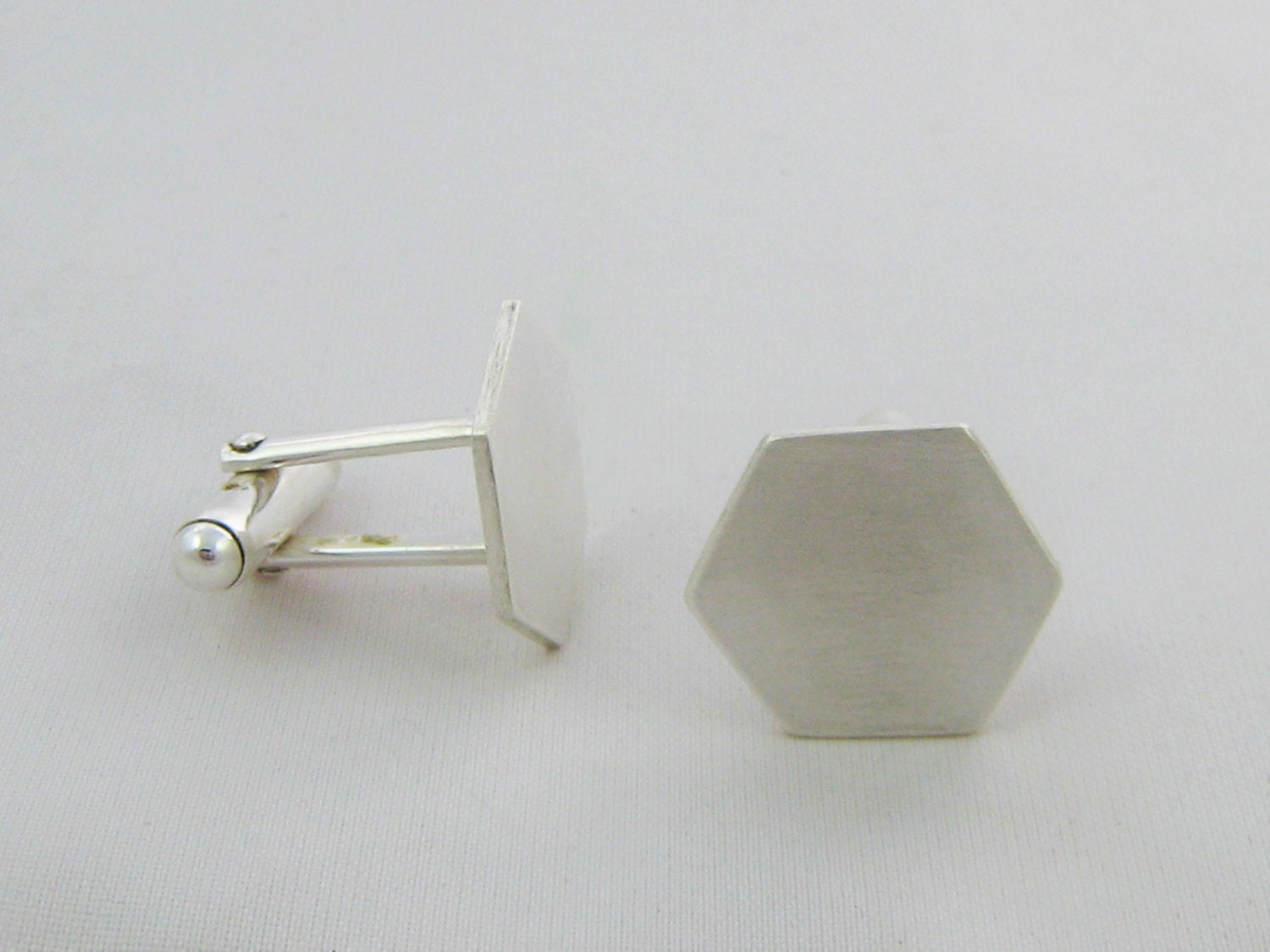These simple sterling silver cufflinks are stylish and understated. The hexagon has been hand-cut from sterling silver sheet and given a matte finish but you can choose a high polish finish if you prefer.
