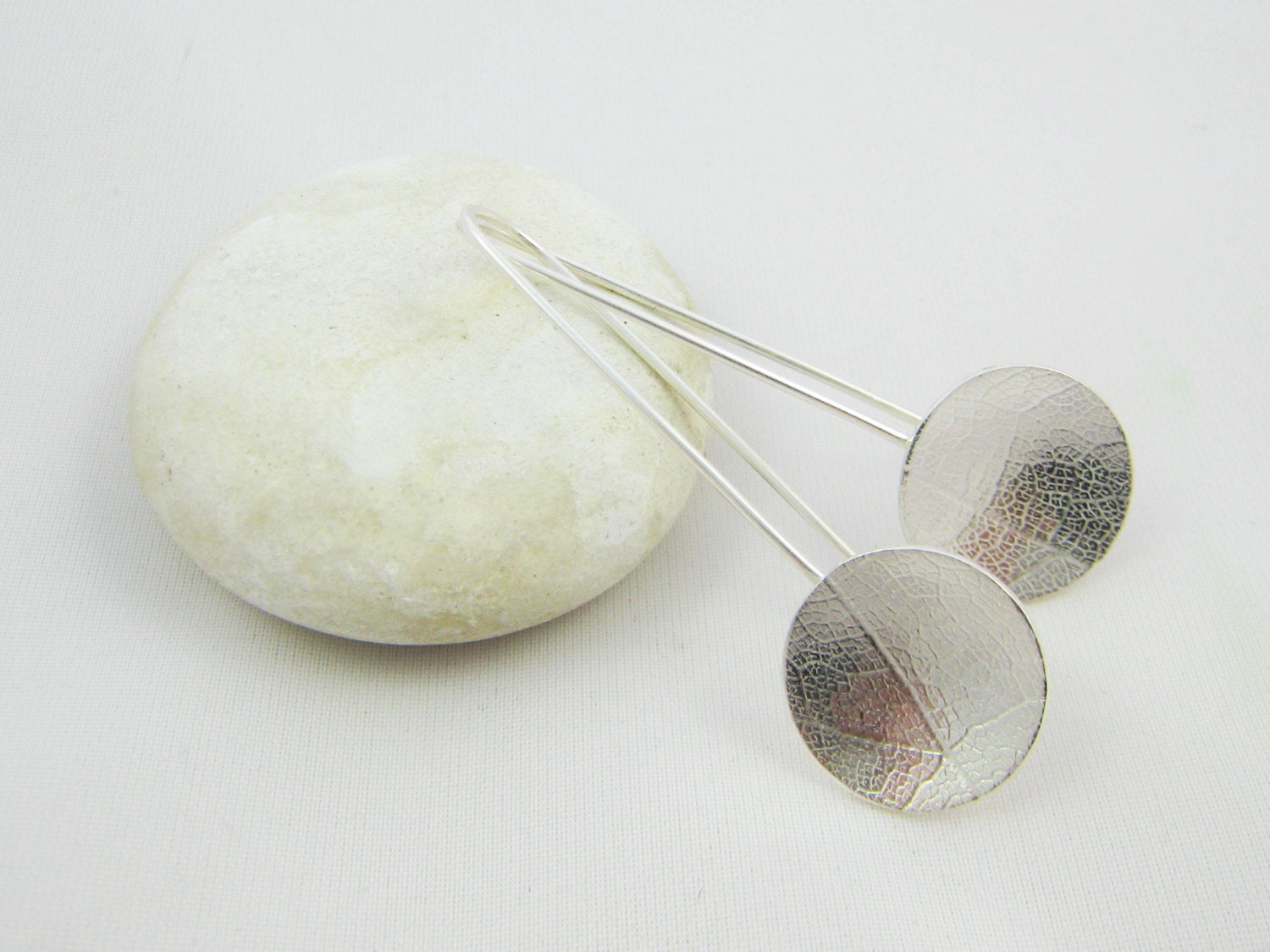 These minimalist sterling silver leaf textured earrings are modern and contemporary. They are lightweight, comfortable and easy to slide on. The circles have been cut, textured, domed, soldered and polished for a simple look. If you would like the leaf texture to be oxidised please let me know.
