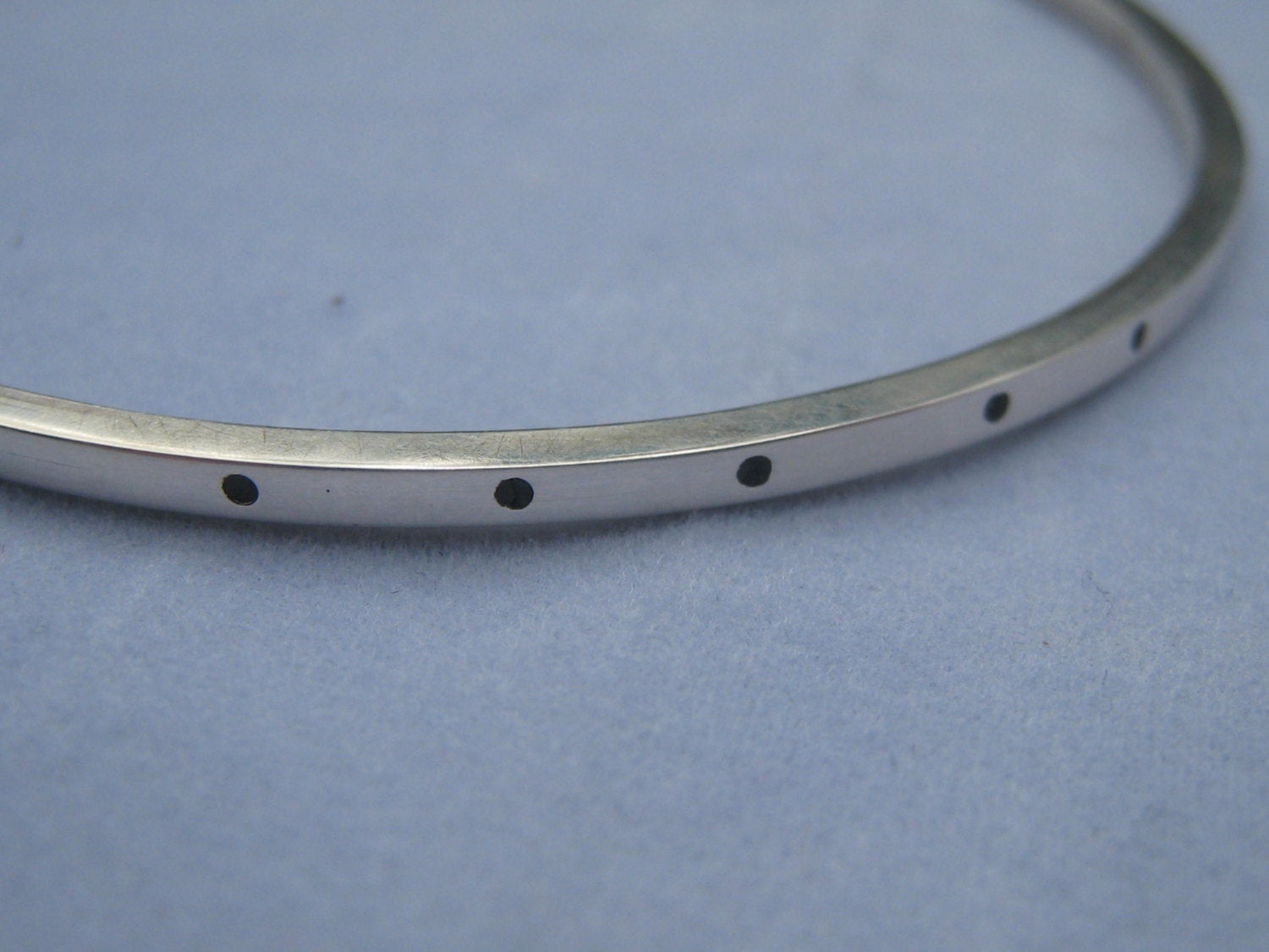 This bangle has been hand formed, fabricated and polished for a high polish finish. I have drilled dots and oxidised them to enhance the pattern.