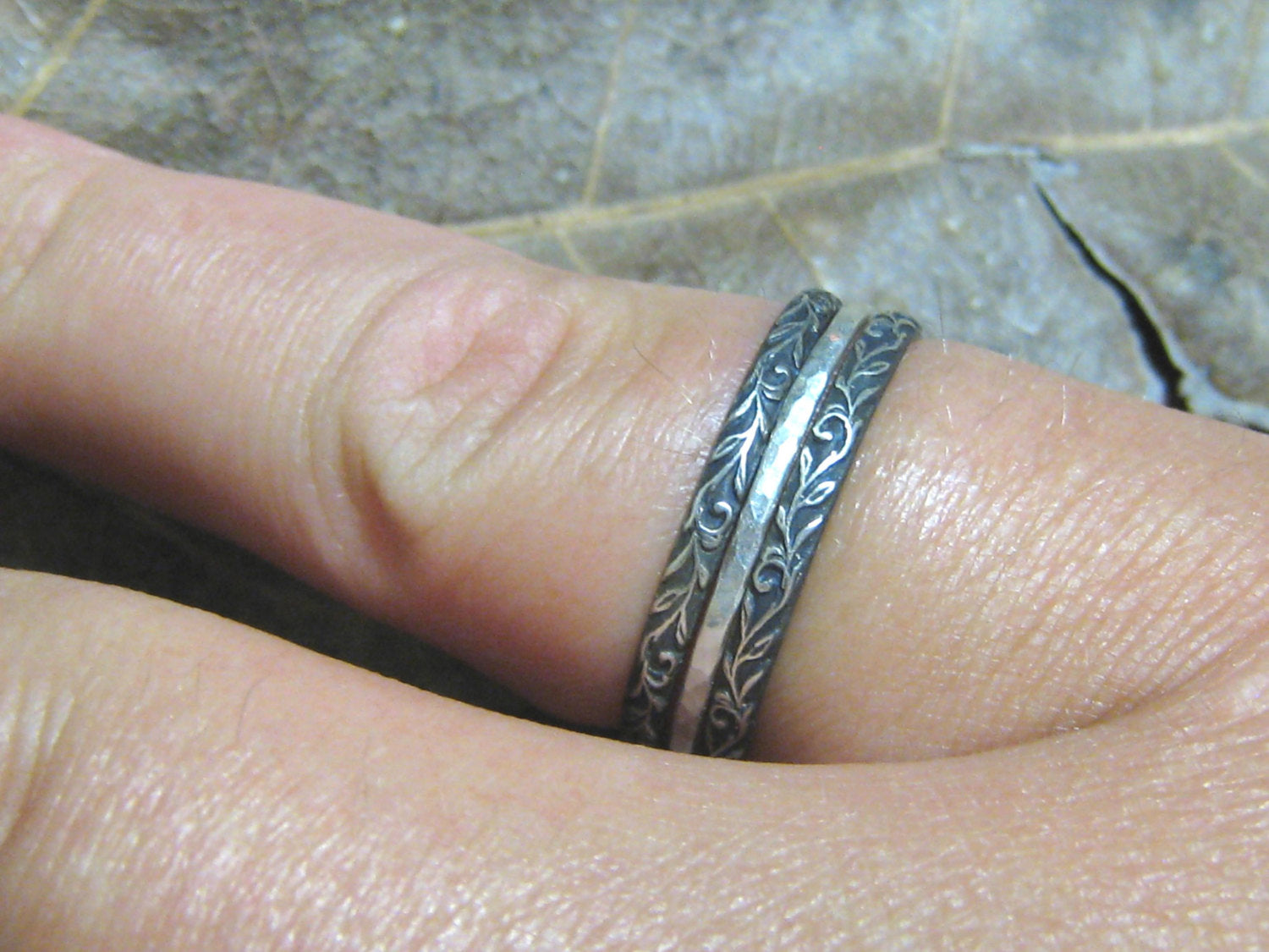 All three rings are made from sterling silver and have been hand formed and fabricated. The middle stacker ring has been hammered and the outer two rings (posey rings) have been oxidised to highlight the vine pattern.