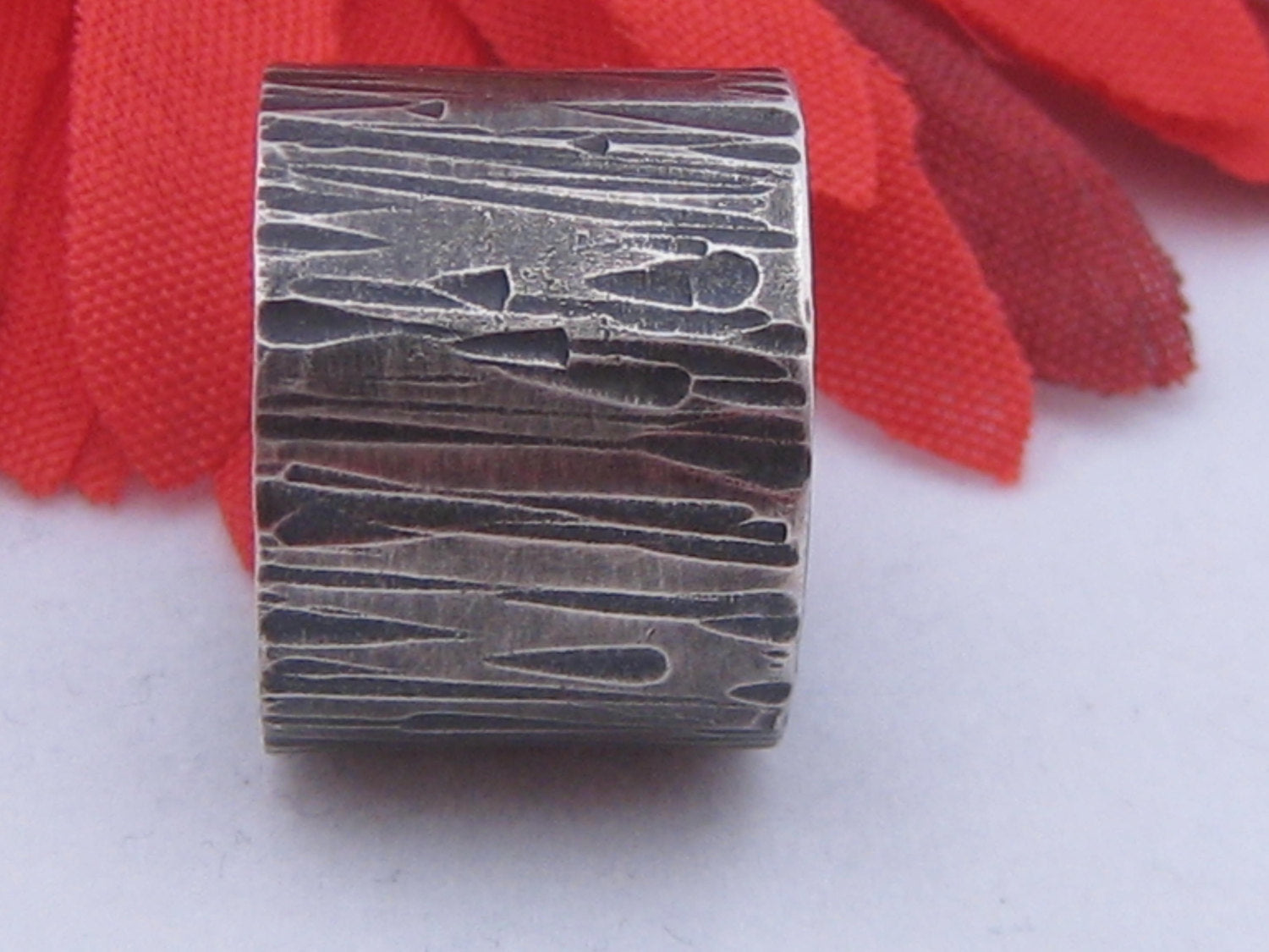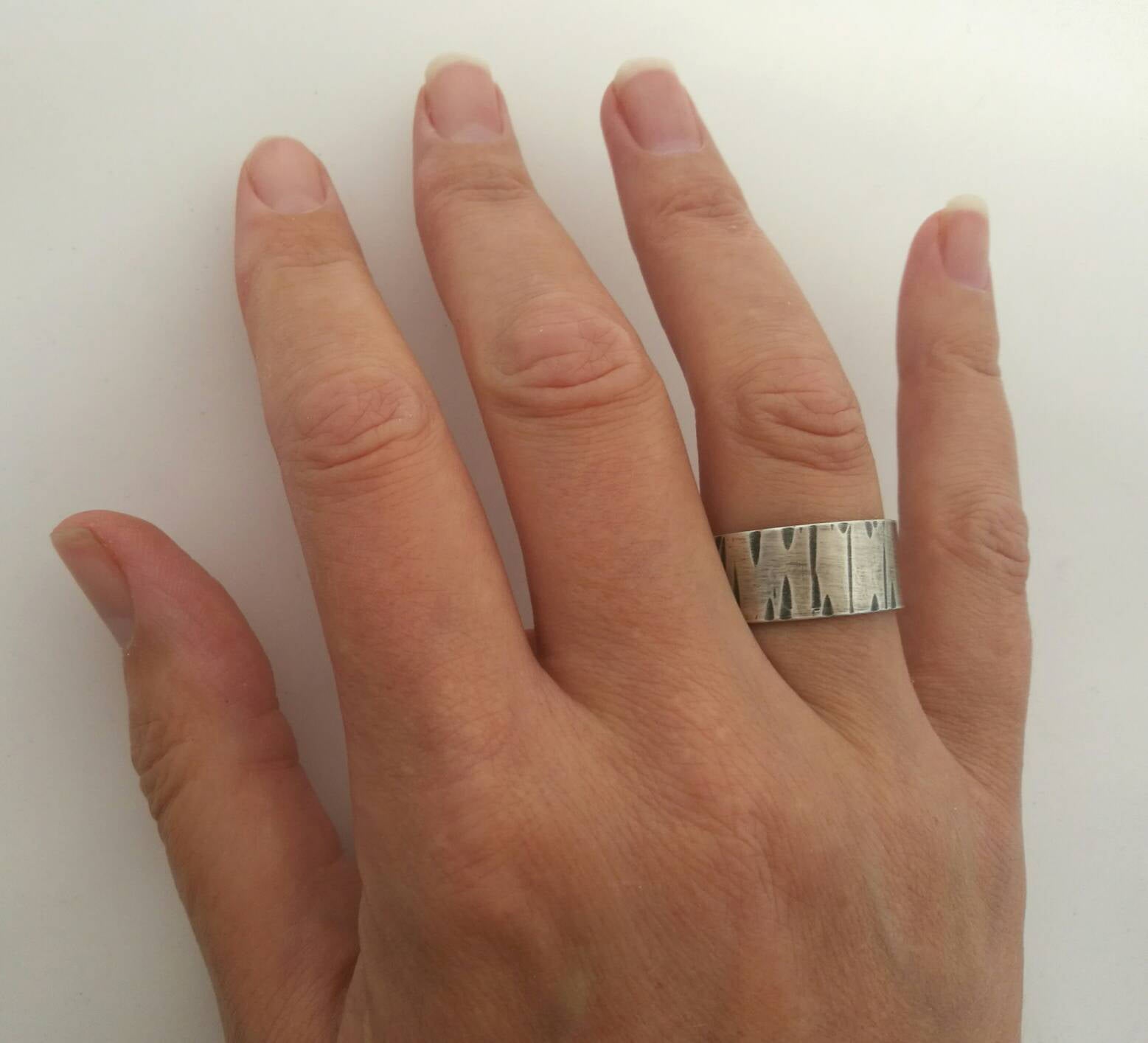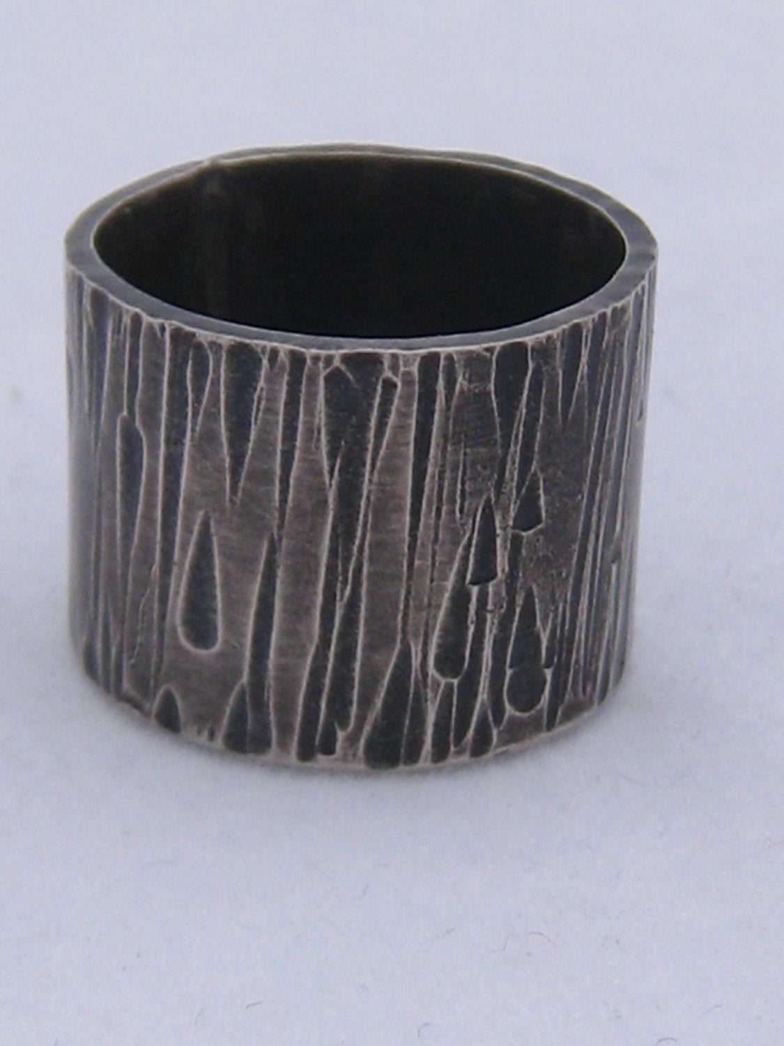 This ring has been hand-cut, formed, fabricated and hammered for a textured finish. The texture has been randomly made, therefore, the ring you order will have a similar pattern. Liver of Sulfer has been added to oxidise the ring. Please note that oxidising isn't completely permanent and will wear over time to a patina unique to you.