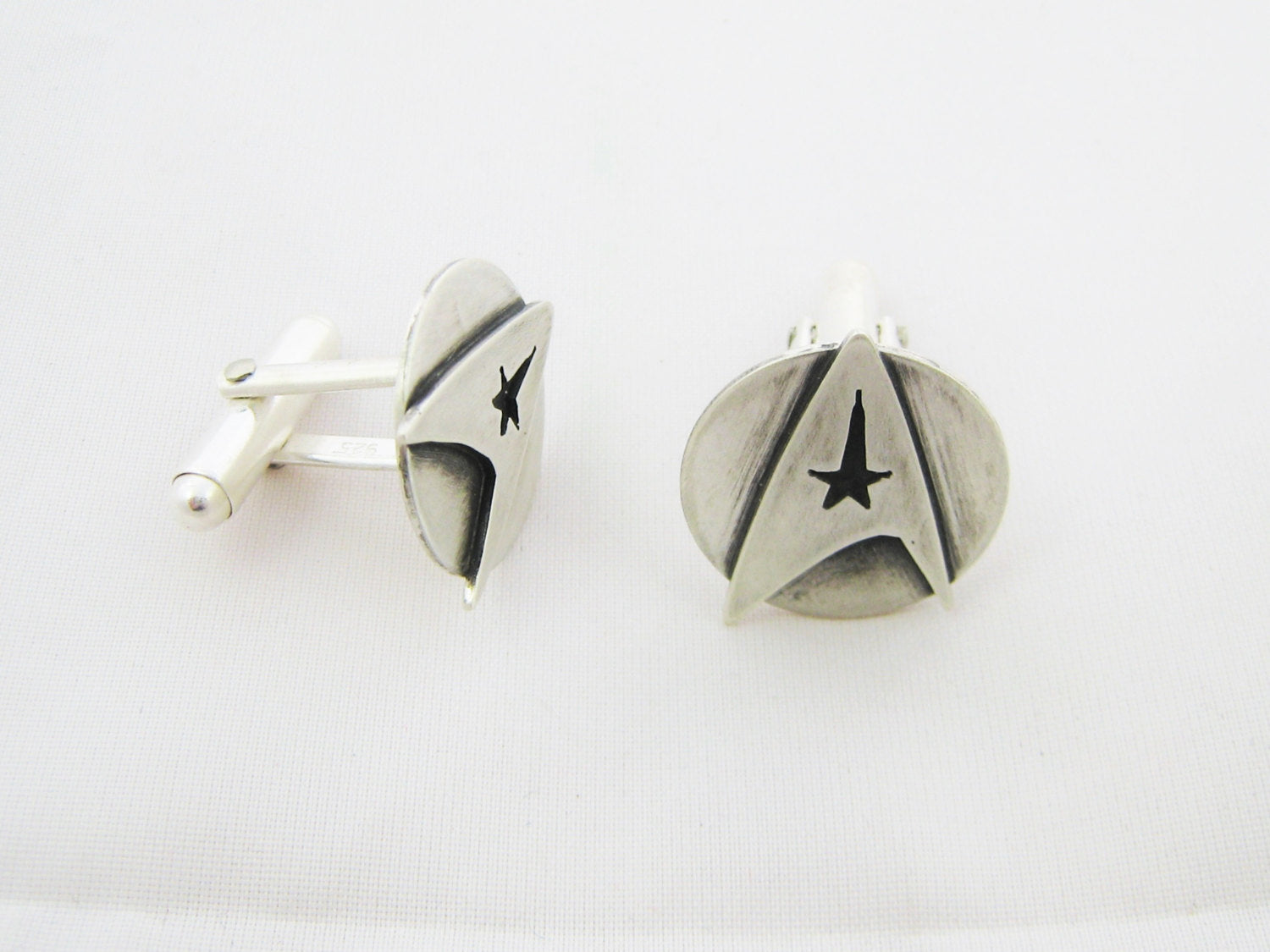 These simple sterling silver cufflinks are a stylish addition to any Star Trek fan's collection. The Star Trek symbols have been hand-cut from sterling silver sheet and given a matte finish. I have also oxidised the cufflinks to give an added depth to the design.