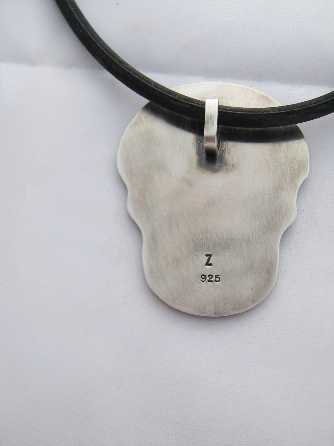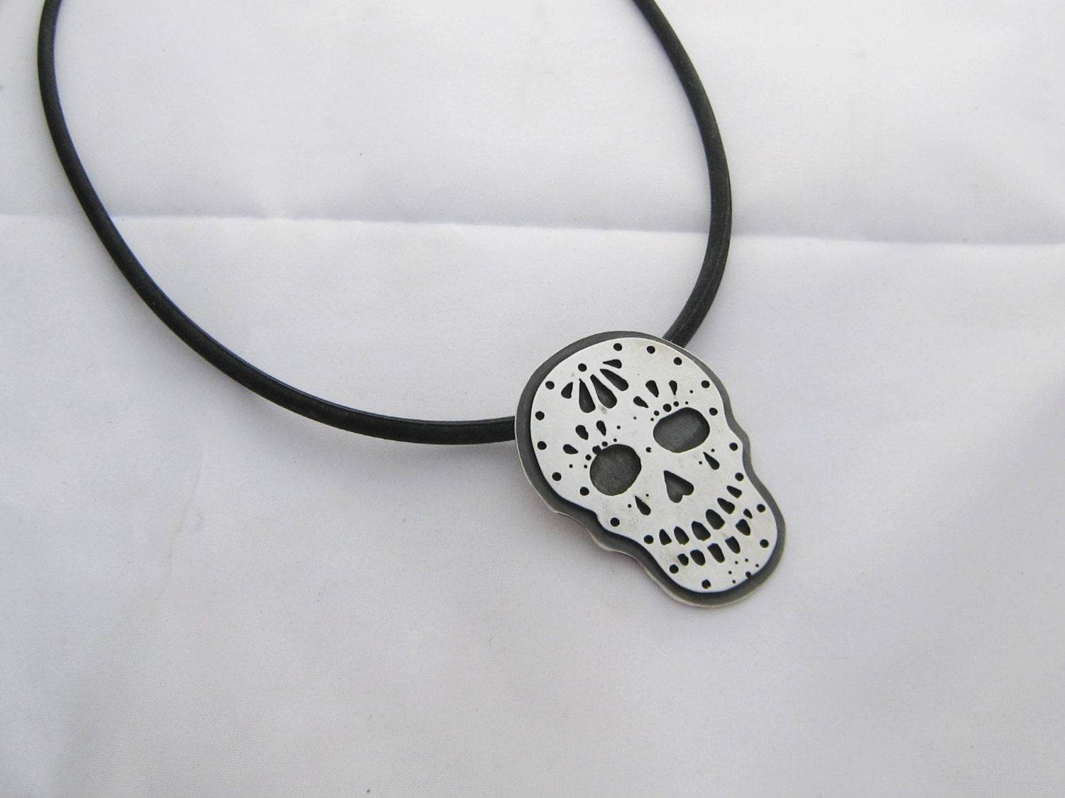 This handmade sugar skull necklace will make an awesome present for any fan of the Day of the Dead or Halloween. The pendant has been made from sterling silver plate and has been hand cut, soldered, sanded and finished. The pendant hangs on a thick rubber necklace. The rubber necklace has an easy open/close clasp. The pendant has been oxidised and sanded to allow for contrast and depth to the design.