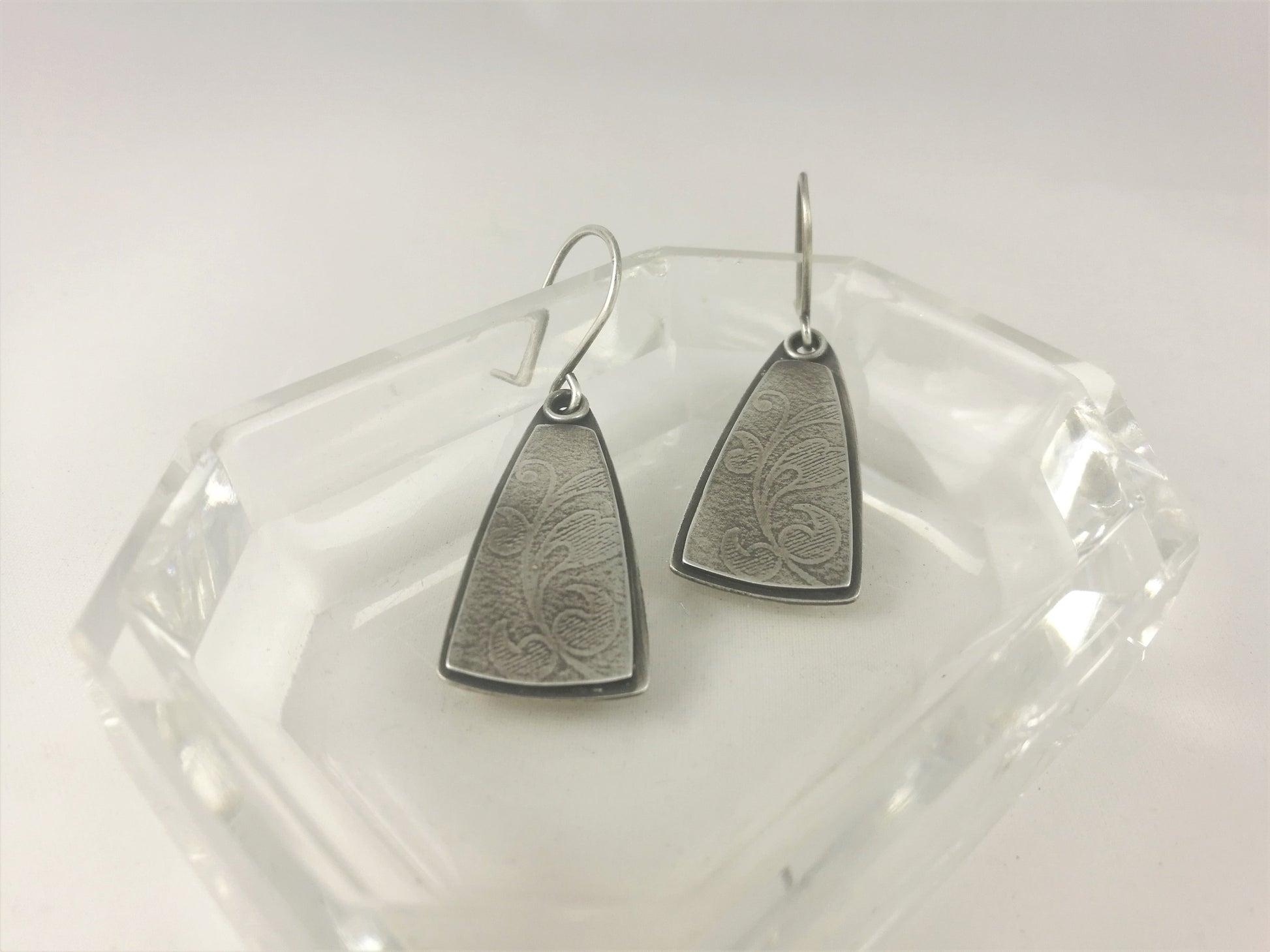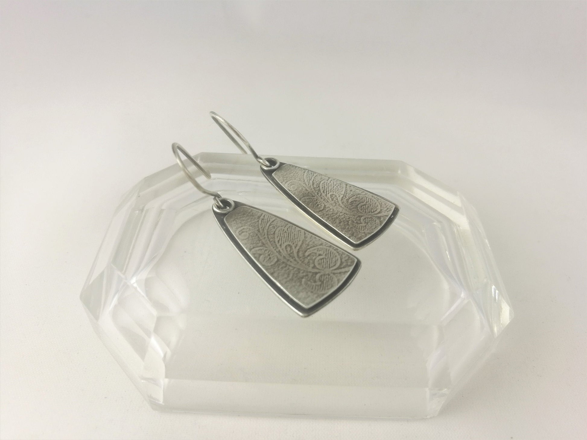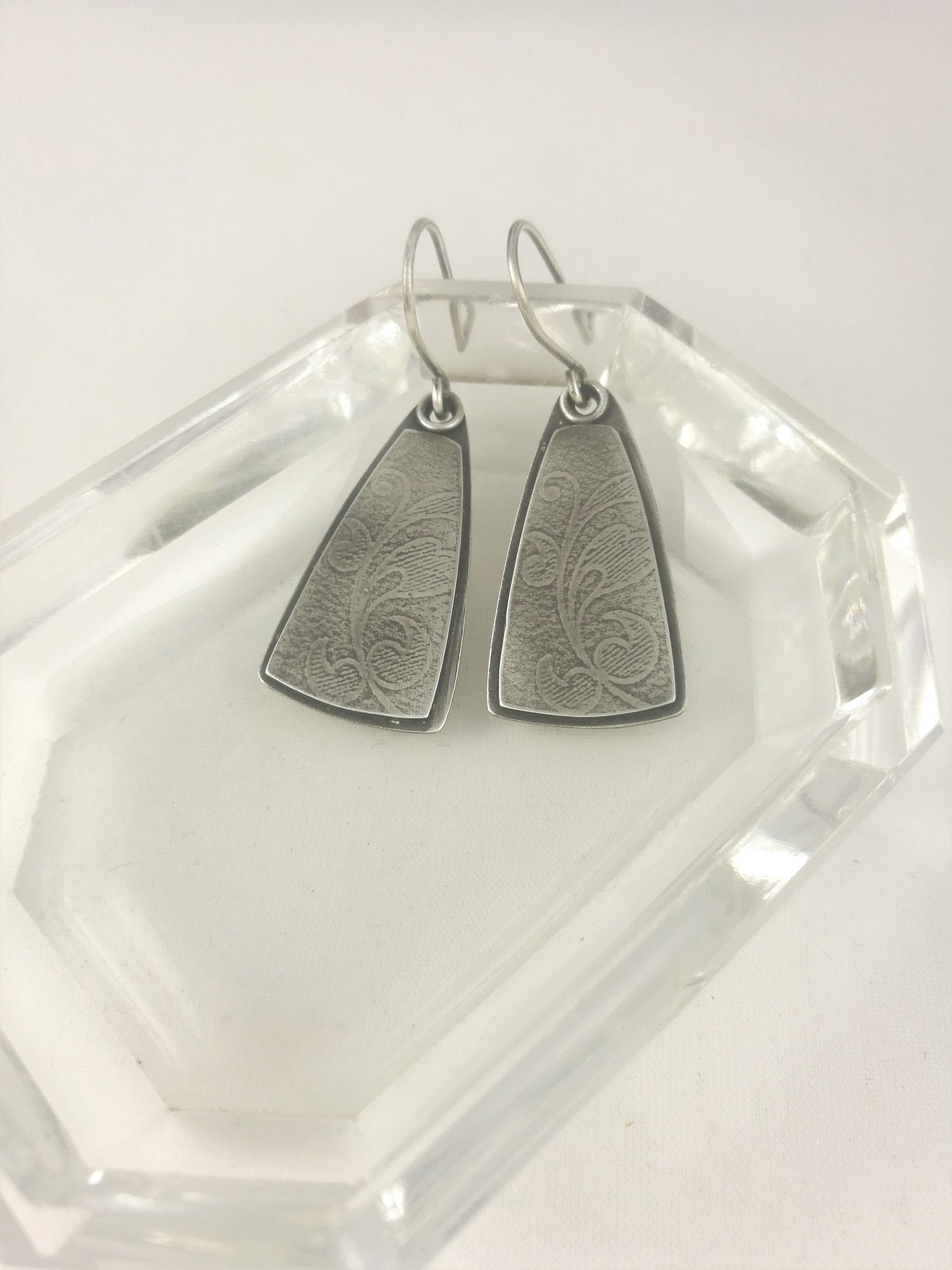 These textured earrings make a statement! I have textured and cut sterling silver sheet, then soldered the textured sheet onto more sterling silver plate for a layered look. The earrings have been oxidised and polished to highlight the detail in the texture.